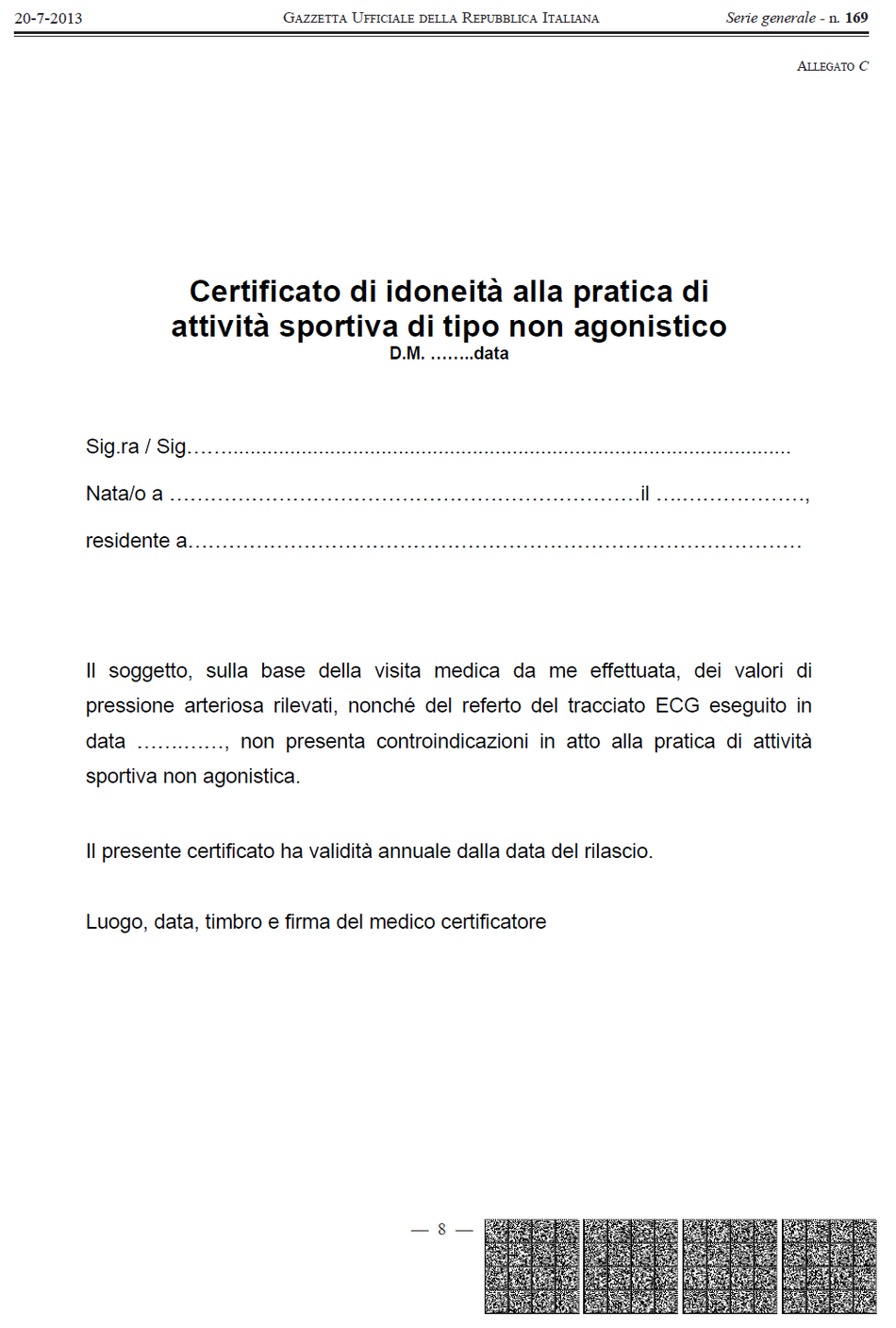 Il Certificato Medico di idoneità per attività sportiva non agonistica per essere valido ed essere accettato dalla nostra Associazione deve essere aderente a questo modello tratto dalla Gazzetta Ufficiale. In particolare deve avere la dicitura "Certificato di idoneità per attività sportiva non agonistica", riportare la data di emissione e la data di scadenza oppure il periodo temporale di validità.